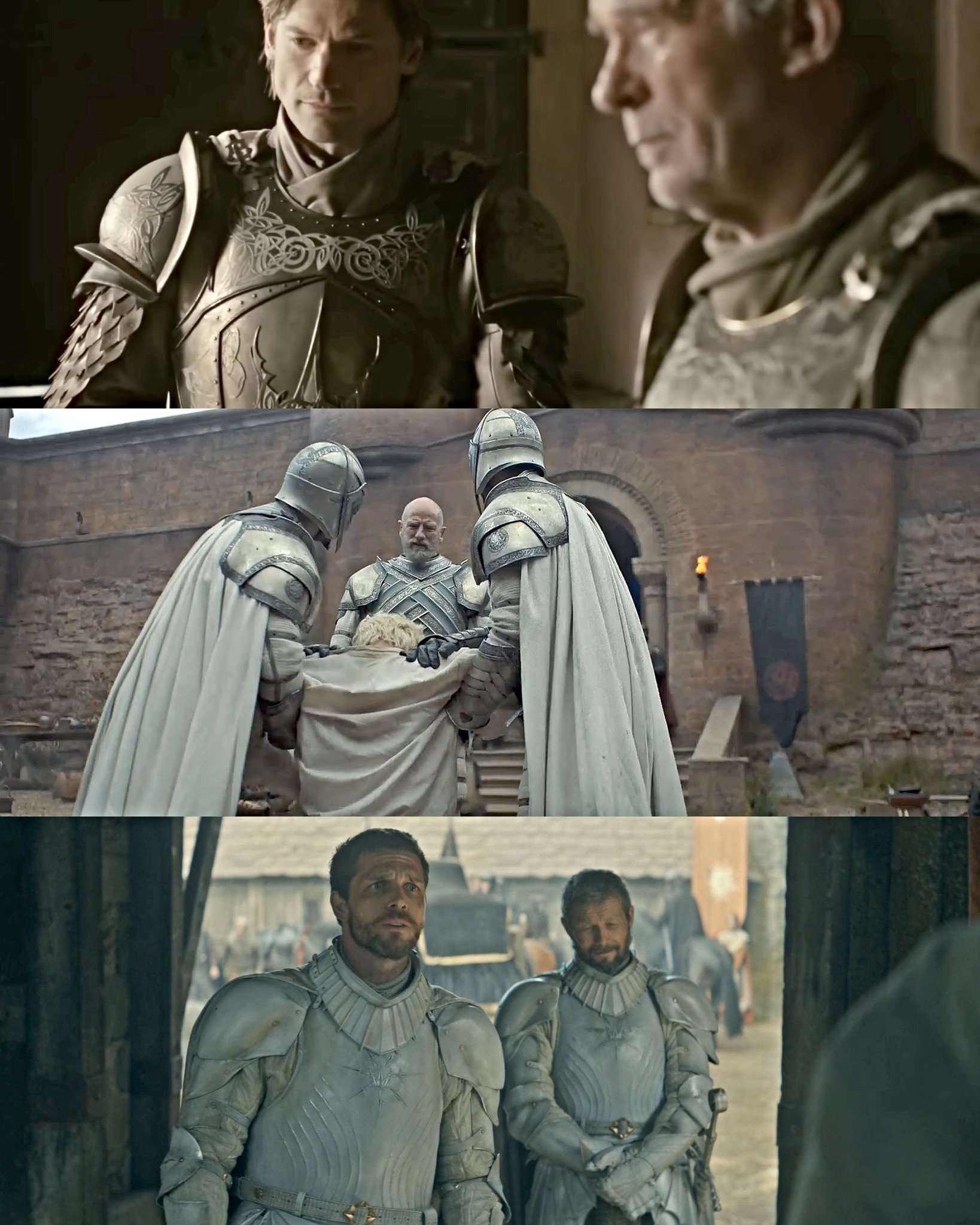 Production-wise, the armor has been lauded for realism in movement and detail. Reaction mashups show fans gasping at the “insane” or “beautiful” look during reveals. The white suits stand out amid vibrant house armors—Baratheon stag motifs, Targaryen dragons—making the Kingsguard visually distinct as neutral protectors.