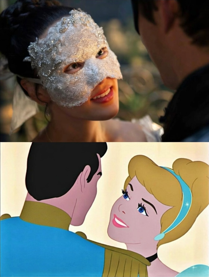 The parallels begin with the central setup. In Cinderella, a young woman of lowly status—mistreated by her stepfamily—attends a grand ball in disguise, captivates a prince, and flees at midnight, leaving behind a glass slipper. Bridgerton mirrors this closely: Sophie, a maid enduring hardship under her cruel stepmother Araminta Gun (Katie Leung) and stepsisters, sneaks into Violet Bridgerton’s lavish masquerade ball wearing borrowed finery, including silver heels and heirloom gloves embroidered with a family crest. She shares a magical dance and connection with Benedict, the artistic second Bridgerton son, before vanishing as the clock strikes, leaving behind one monogrammed glove as her “slipper.”