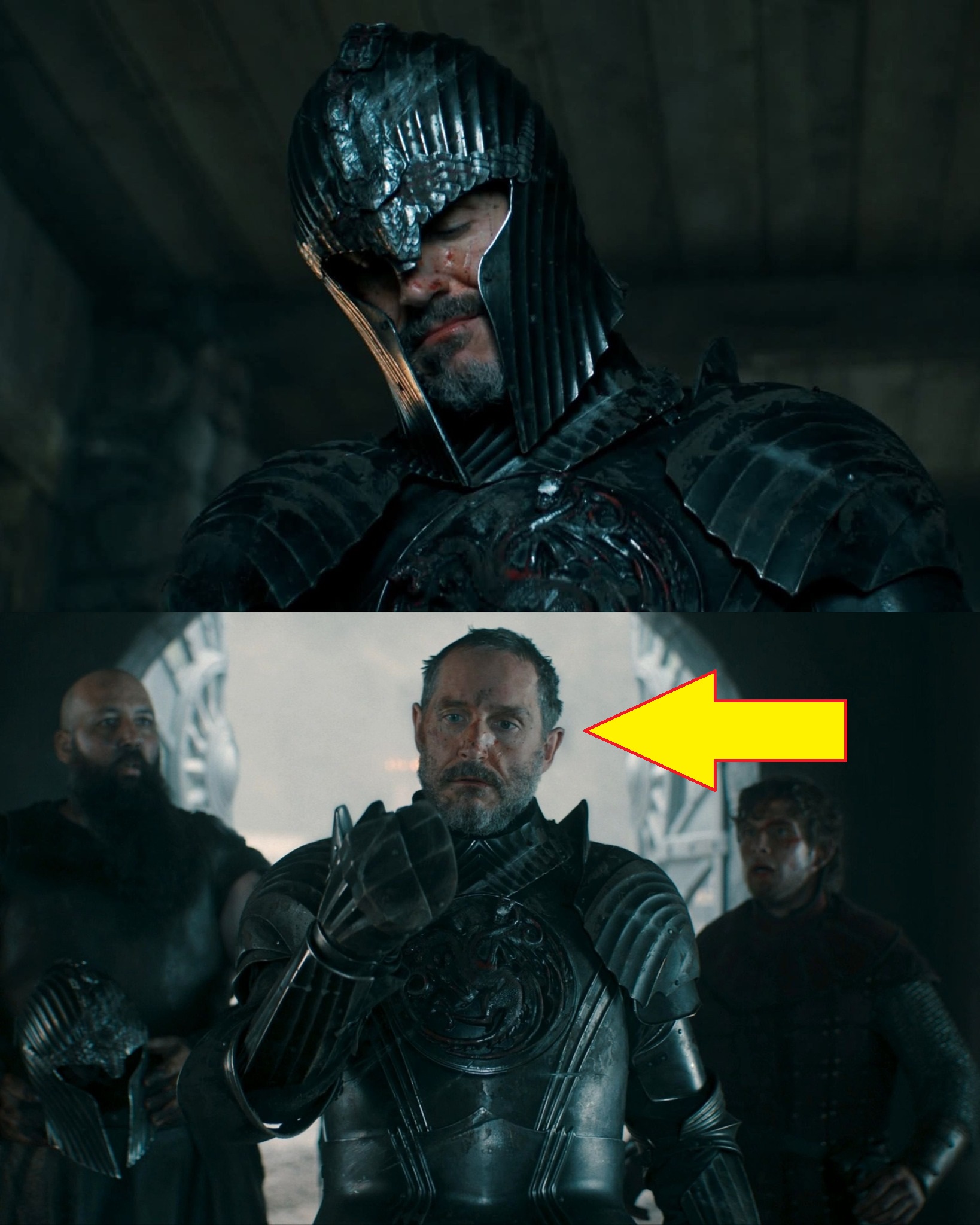 Showrunner Ira Parker addressed the scene directly in interviews, describing it as intentionally brutal. “The situation with Baelor is that his life is being held together by the fact that he has his helmet on. He’s already a dead man, he just doesn’t realize it yet,” Parker told outlets like the New York Post. “When that helmet comes off and he dies right there, it’s the most brutal type of death.” The explanation ties into the injury’s mechanics: a powerful mace strike from Prince Maekar during the chaotic melee dented and crushed the helmet inward at the rear, fracturing the skull beneath. The pressure from the deformed armor apparently stabilized the wound temporarily, preventing immediate catastrophic brain herniation or massive bleeding. Removing the helm released that pressure, allowing the damaged brain to shift fatally.
